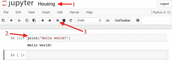 这一步做了三件事:首先,在工作空间中创建了一个新的笔记本文件Untitled.ipynb;第二,它启动了一个 Jupyter 的 Python 内核来运行这个笔记本;第三,在一个新栏中打开这个笔记本。接下来,点击Untitled,将这个笔记本重命名为Housing(这会将ipynb文件自动命名为Housing.ipynb)。