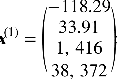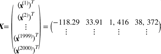 X是包含数据集中所有实例的所有特征值(不包含标签)的矩阵。每一行是一个实例,第i行是x^(i)的转置,记为x^(i)^T。例如,仍然是前面提到的第一区,矩阵