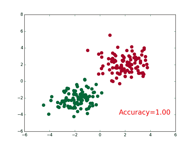 if t % 2 == 0: plt.cla() prediction = torch.max(F.softmax(out), 1)[1] pred_y = prediction.data.numpy().squeeze() target_y = y.data.numpy() plt.scatter(x.data.numpy()[:, 0], x.data.numpy()[:, 1], c=pred_y, s=100, lw=0, cmap=\'RdYlGn\') accuracy = sum(pred_y == target_y)/200 # 预测中有多少和真实值一样 plt.text(1.5, -4, \'Accuracy=%.2f\' % accuracy, fontdict={\'size\': 20, \'color\': \'red\'}) plt.pause(0.1)