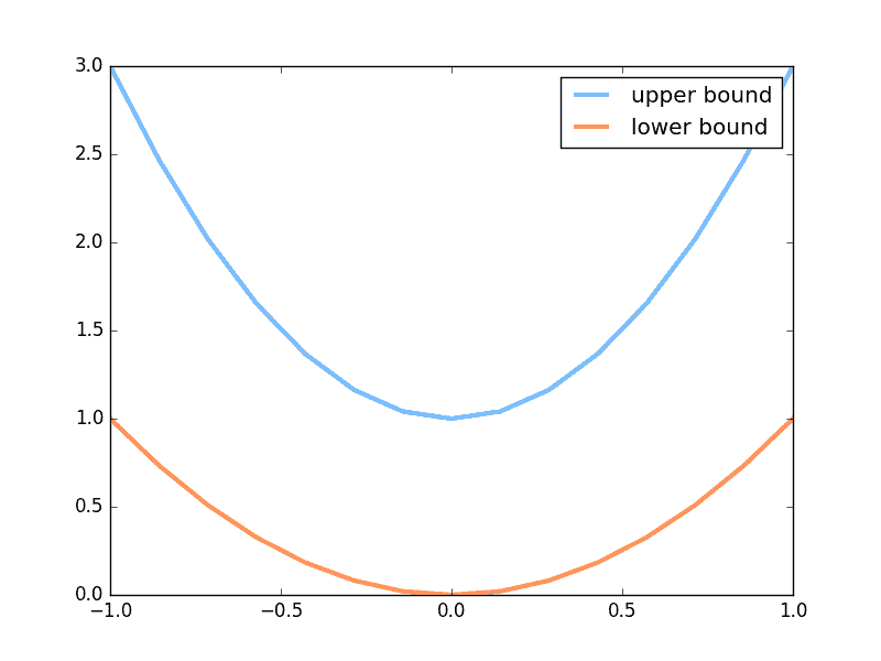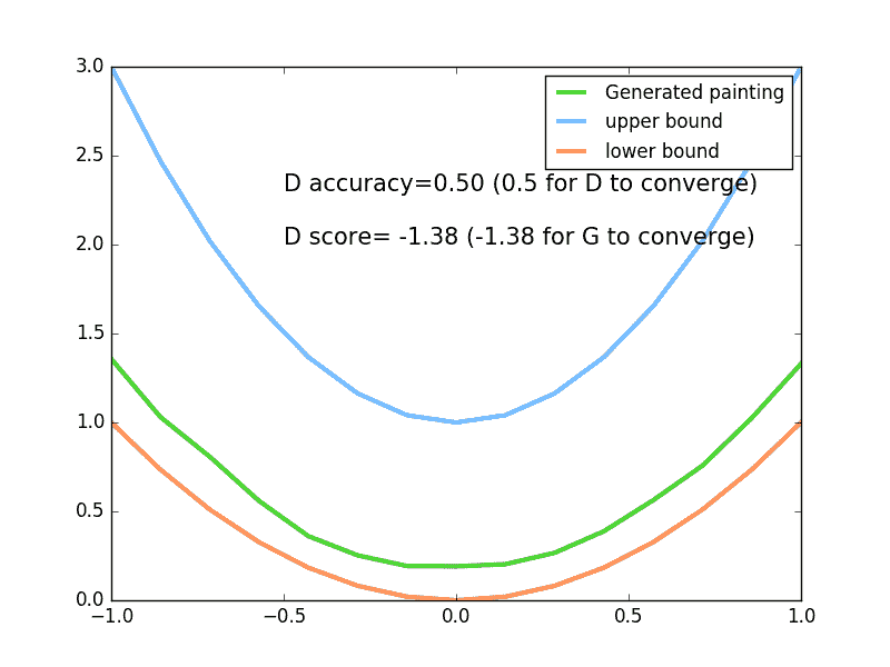 下面是本节内容的效果, 绿线的变化是新手画家慢慢学习如何踏上画家之路的过程. 而能被认定为著名的画作在 upper bound 和 lower bound 之间.