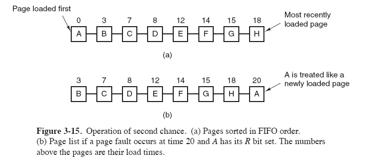 当页面被访问 (读或写) 时设置该页面的 R 位为 1。需要替换的时候,检查最老页面的 R 位。如果 R 位是 0,那么这个页面既老又没有被使用,可以立刻置换掉;如果是 1,就将 R 位清 0,并把该页面放到链表的尾端,修改它的装入时间使它就像刚装入的一样,然后继续从链表的头部开始搜索。