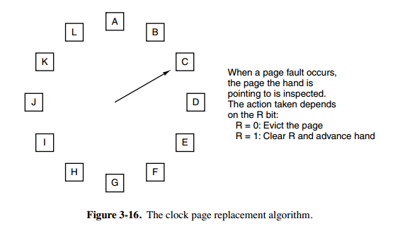 - 如果第1)步失败,则重新扫描,查找(u=0, m=1)的帧。选择遇到的第一个这样的帧用于替换。在这个扫描过程中,对每个跳过的帧,把它的使用位设置成0。