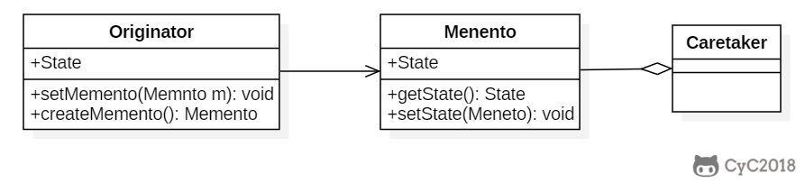 Menento:备忘录,存储原始对象的的状态。备忘录实际上有两个接口,一个是提供给 Caretaker 的窄接口:它只能将备忘录传递给其它对象;一个是提供给 Originator 的宽接口,允许它访问到先前状态所需的所有数据。理想情况是只允许 Originator 访问本备忘录的内部状态。