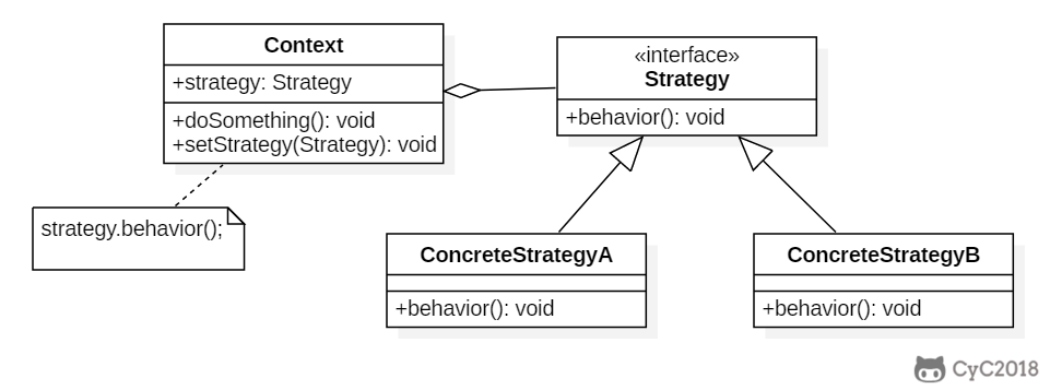 Context 是使用到该算法族的类,其中的 doSomething() 方法会调用 behavior(),setStrategy(Strategy) 方法可以动态地改变 strategy 对象,也就是说能动态地改变 Context 所使用的算法。