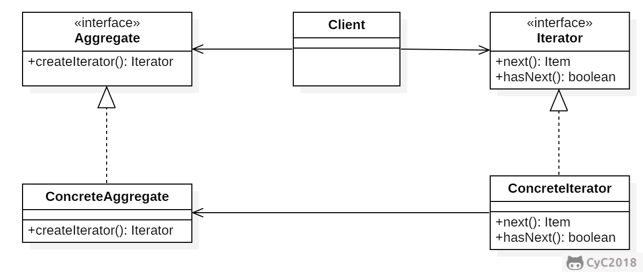 Aggregate 是聚合类,其中 createIterator() 方法可以产生一个 Iterator;