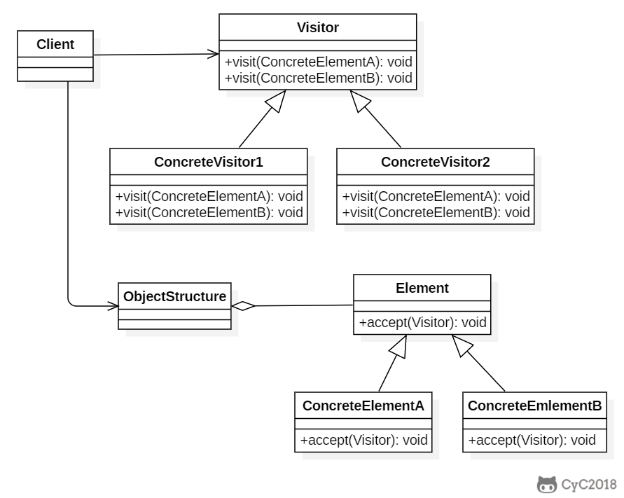 Visitor:访问者,为每一个 ConcreteElement 声明一个 visit 操作