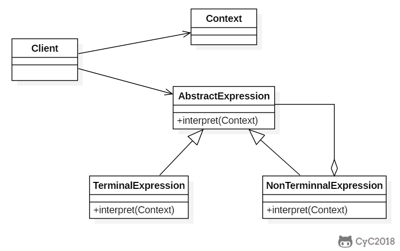 1 2 3 public abstract class Expression { public abstract boolean interpret (String str) ; }