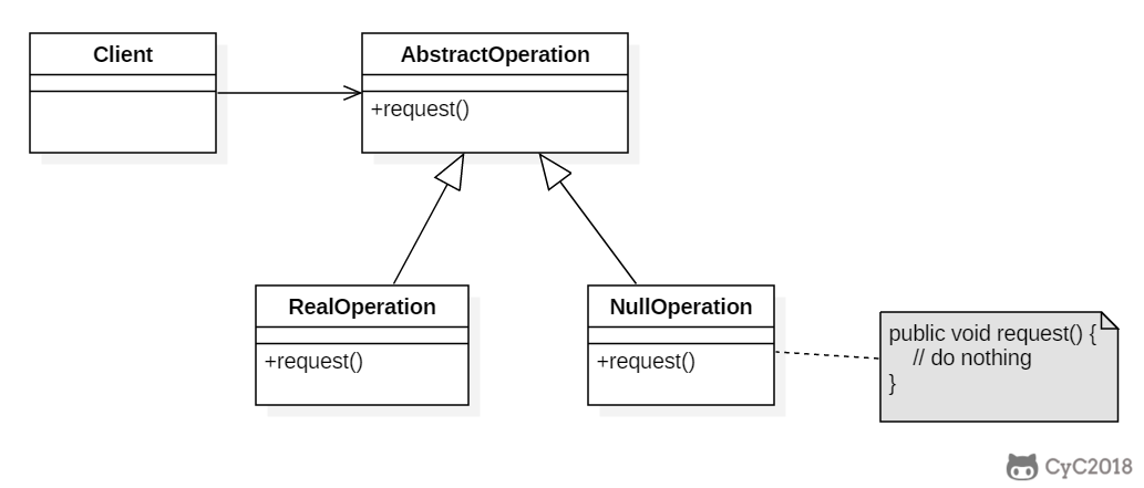 1 2 3 4 5 6 public class NullOperation extends AbstractOperation { @Override void request () { } }