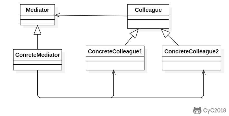 Mediator:中介者,定义一个接口用于与各同事(Colleague)对象通信。