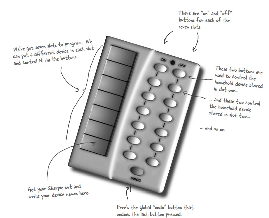 1 2 3 4 5 6 7 8 9 10 11 12 13 14 15 16 17 18 19 20 21 22 23 24 25 26 27 28 29 public class Invoker { private Command[] onCommands; private Command[] offCommands; private final int slotNum = 7 ; public Invoker () { this .onCommands = new Command [slotNum]; this .offCommands = new Command [slotNum]; } public void setOnCommand (Command command, int slot) { onCommands[slot] = command; } public void setOffCommand (Command command, int slot) { offCommands[slot] = command; } public void onButtonWasPushed (int slot) { onCommands[slot].execute(); } public void offButtonWasPushed (int slot) { offCommands[slot].execute(); } }