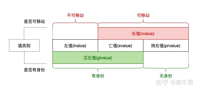 值类别分为:左值(lvalue)、亡值(xvalue) 和 纯右值(prvalue),任一个表达式都可以唯一地归类到这三种值类别中的一个,这三种类别称为基础类别(primary category)。除了这三种基础类别外,还有两种混合类别(mixed category):泛左值(glvalue)和右值(rvalue),泛左值包括左值和亡值,右值包括亡值和纯右值。