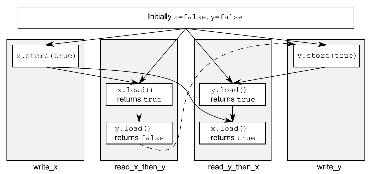 虚线始于read_x_then_y中对y的加载操作,到达write_y中对y的存储,其暗示了排序关系需要保持序列一致:在操作的全局操作顺序memory_order_seq_cst中,加载操作必须在存储操作之前发生,就产生了图中的结果。