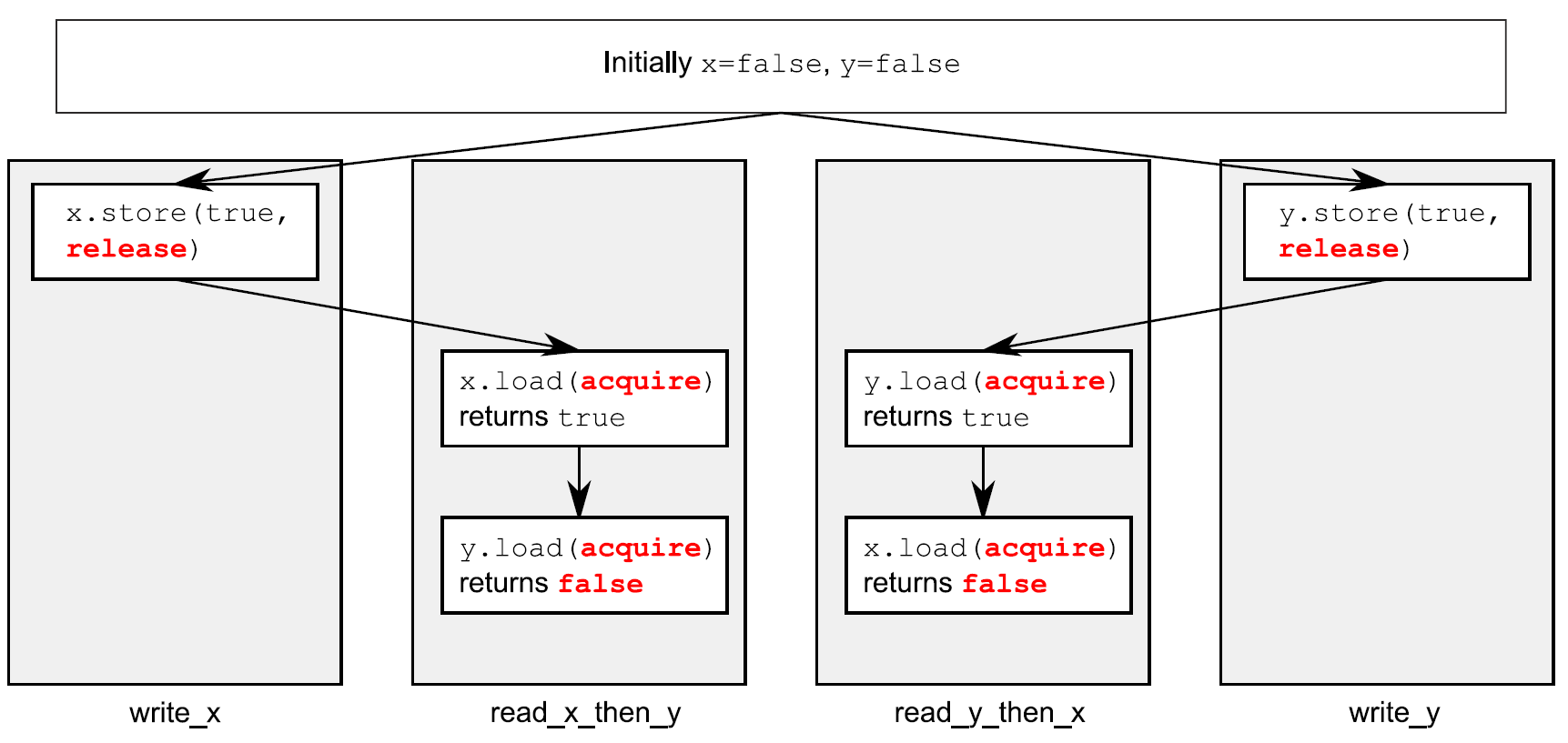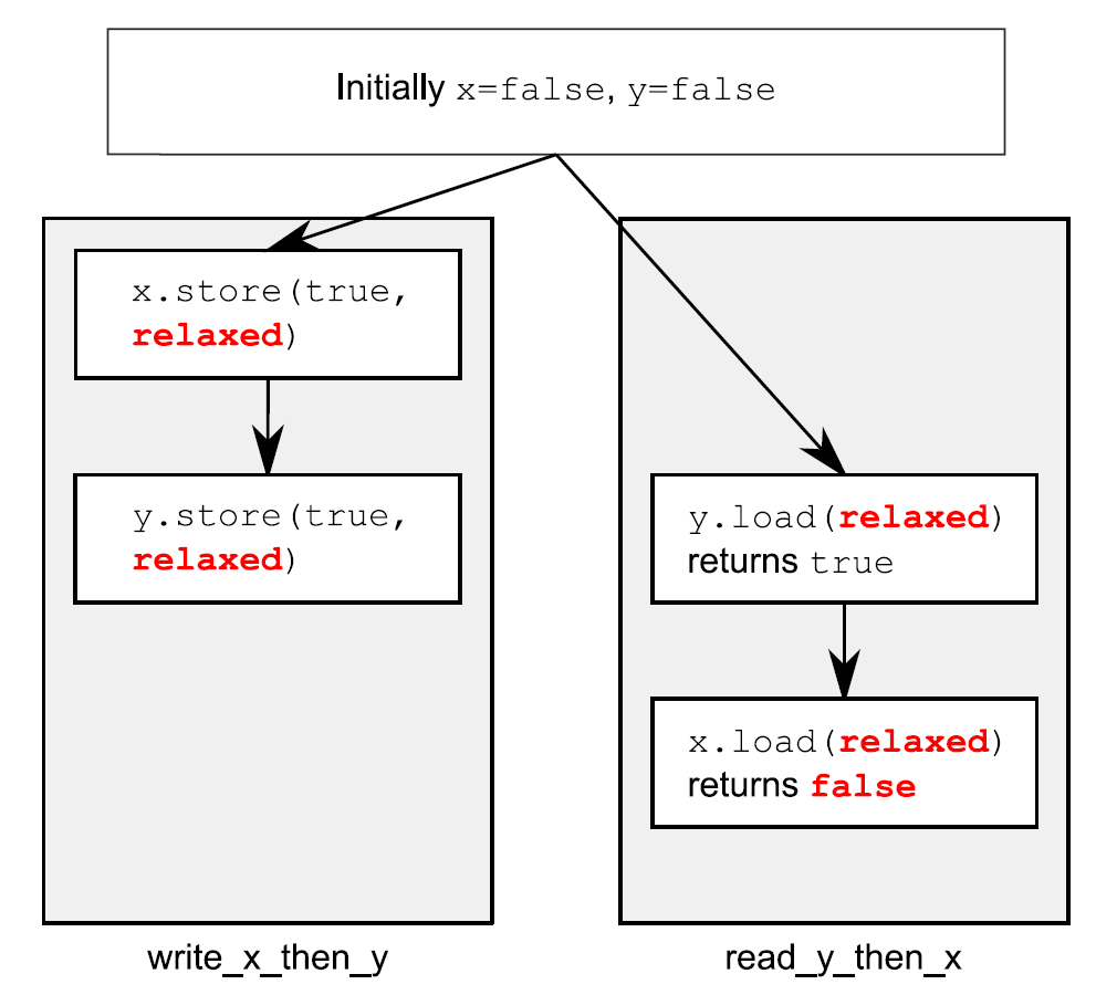 这次assert⑤可能会触发,因为加载x的操作④可能读取到false,即使加载y的操作③读取到true,并且存储x的操作①先发与存储y的操作②。x和y是两个不同的变量,所以这里没有顺序去保证每个操作产生相关值的可见性。