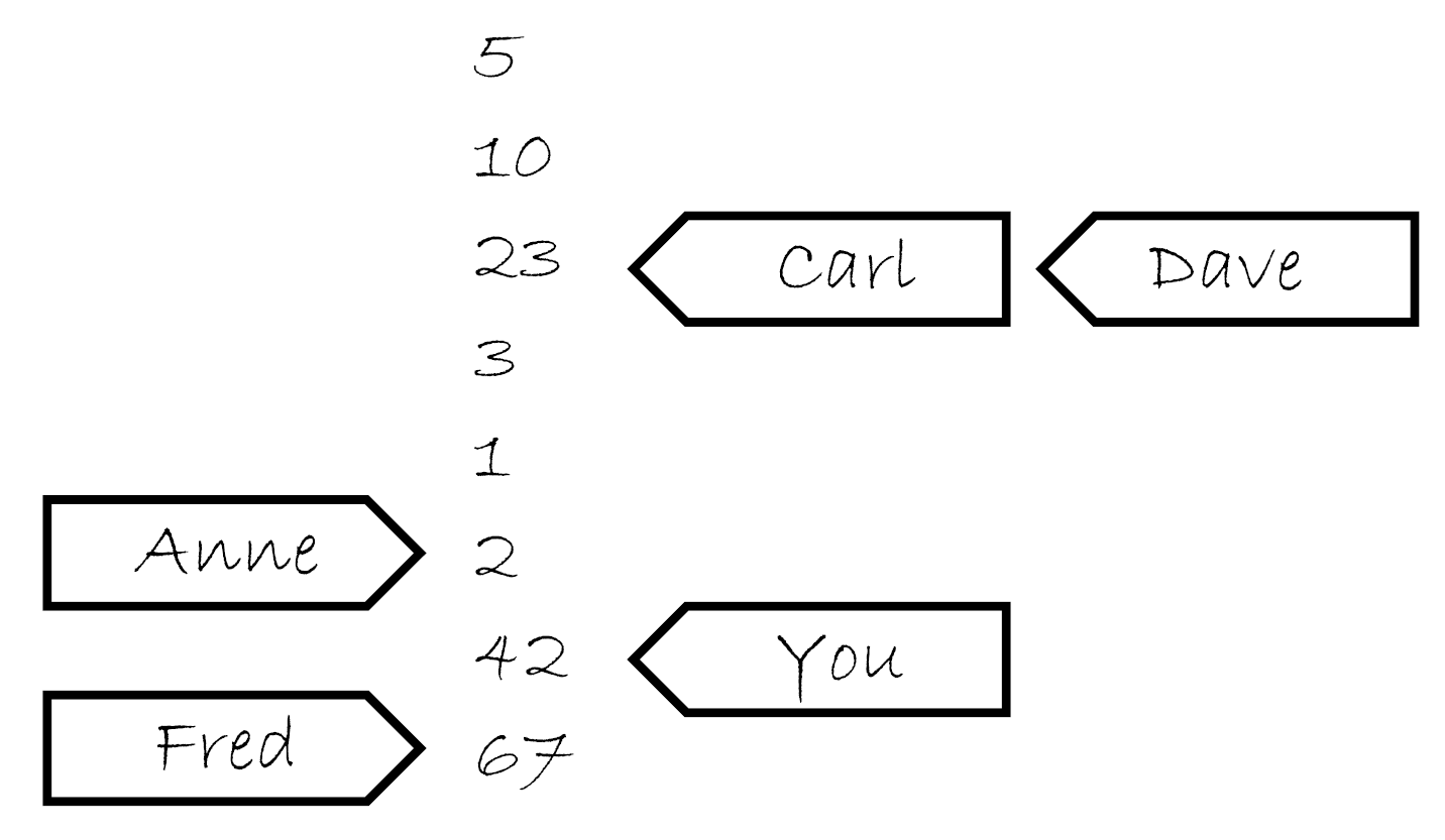试想当他的笔记本上开始有5,10,23,3,1,2这几个数。如果你问他索要一个值,你可能获取这几个数中的任意一个。如果他给你10,那么下次再问他要值的时候可能会再给你10,或者10后面的数,但绝对不会是5。如果那你问他要了五次,他就可能回答“10,10,1,2,2”。如果你让他写下42,他将会把这个值添加在列表的最后。如果你再问他要值,他可能会告诉你“42”,直到有其他值写在了后面并且他认为他愿意将那个数告诉你。
