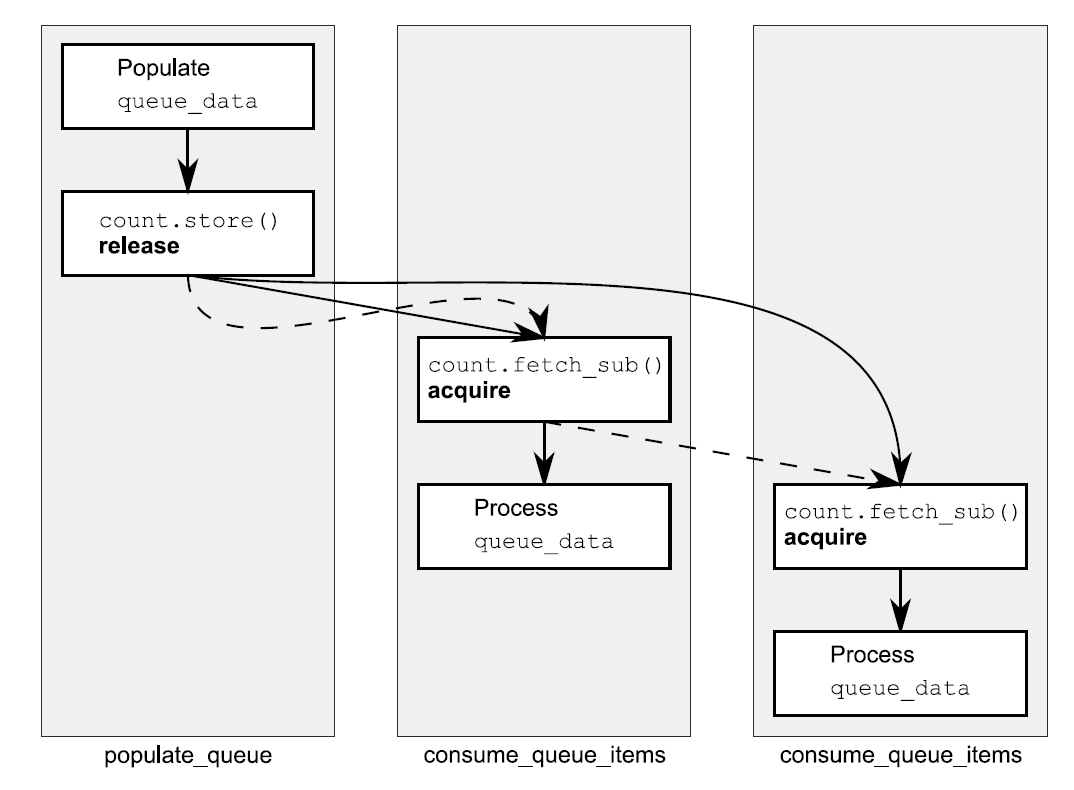 一种处理方式是让线程产生数据,并存储到一个共享缓存中,而后调用count.store(number_of_items, memory_order_release)①让其他线程知道数据是可用的。线程群消耗着队列中的元素,之后可能调用count.fetch_sub(1, memory_order_acquire)②向队列索取一个元素,不过在这之前,需要对共享缓存进行完整的读取④。一旦count归零,那么队列中就没有更多的元素了,当元素耗尽时线程必须等待③。