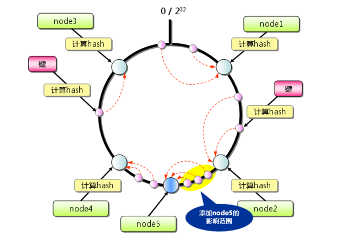 下一步将各个服务器使用Hash进行一个哈希,具体可以选择服务器的ip或主机名作为关键字进行哈希,这样每台机器就能确定其在哈希环上的位置,这里假设将上文中四台服务器使用ip地址哈希后在环空间的位置如下: