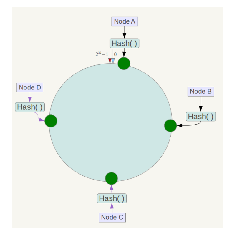 一致性哈希算法(Consistent Hashing)最早在论文《Consistent Hashing and Random Trees: Distributed Caching Protocols for Relieving Hot Spots on the World Wide Web》中被提出。简单来说,一致性哈希将整个哈希值空间组织成一个虚拟的圆环,如假设某哈希函数H的值空间为0-2^32-1(即哈希值是一个32位无符号整形),整个哈希空间环如下: