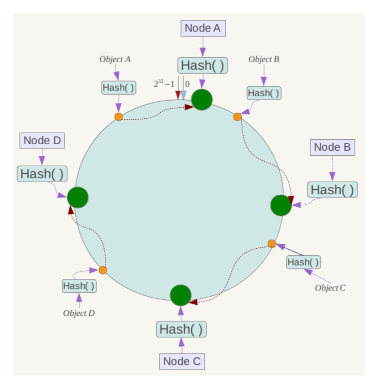 例如我们有Object A、Object B、Object C、Object D四个数据对象,经过哈希计算后,在环空间上的位置如下: