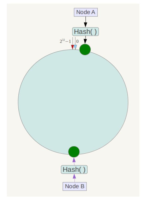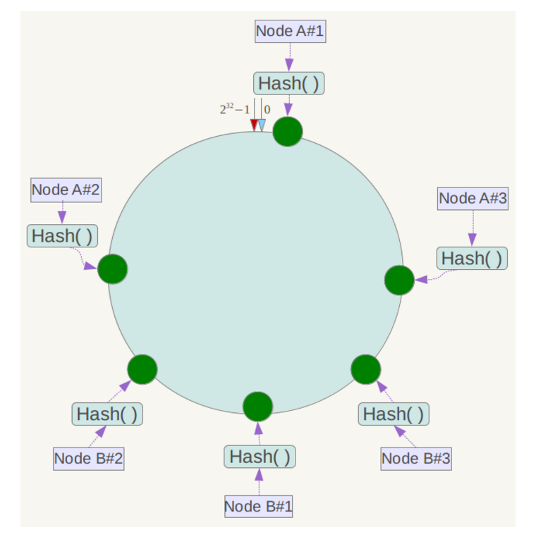 此时必然造成大量数据集中到Node A上,而只有极少量会定位到Node B上。为了解决这种数据倾斜问题,一致性哈希算法引入了虚拟节点机制,即对每一个服务节点计算多个哈希,每个计算结果位置都放置一个此服务节点,称为虚拟节点。具体做法可以在服务器ip或主机名的后面增加编号来实现。例如上面的情况,可以为每台服务器计算三个虚拟节点,于是可以分别计算 “Node A#1”、“Node A#2”、“Node A#3”、“Node B#1”、“Node B#2”、“Node B#3”的哈希值,于是形成六个虚拟节点:
