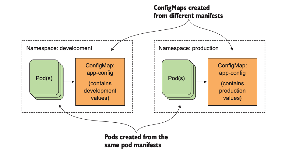 ConfigMap是不需要被读取的,它映射的内容通过环境变量或者卷文件的形式传给容器。一般直接在pod的定义里面就可以声明ConfigMap,这样就可以根据不同的环境创建不同的配置,流程交互如下图所示: