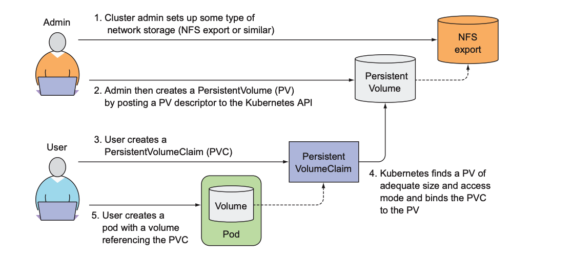 持久卷由管理员创建(各种配置信息),然后用户创建持久卷声明,提交后k8s就会找到匹配的持久卷并将其绑定到持久卷声明。