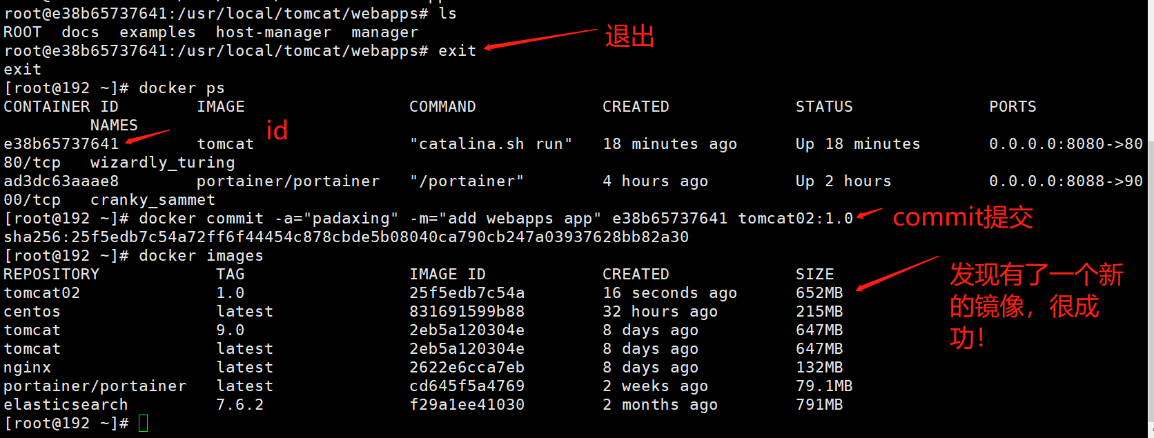 1 | ➜ ~ docker commit -a="zhangxiaoyude" -m="add webapps app" 7b8096067457 tomcat02:1.0 |