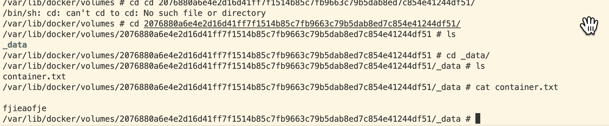1 2 3 4 5 6 7 8 9 10 11 12 ➜ docker volume inspect 635d632e8d79ad10168a6bd6b65ba5b67de68c38c63b619915b6d00db2bd1b4a [ { "CreatedAt": "2022-10-07T10:04:09Z", "Driver": "local", "Labels": null, "Mountpoint": "/var/lib/docker/volumes/635d632e8d79ad10168a6bd6b65ba5b67de68c38c63b619915b6d00db2bd1b4a/_data", "Name": "635d632e8d79ad10168a6bd6b65ba5b67de68c38c63b619915b6d00db2bd1b4a", "Options": null, "Scope": "local" } ]