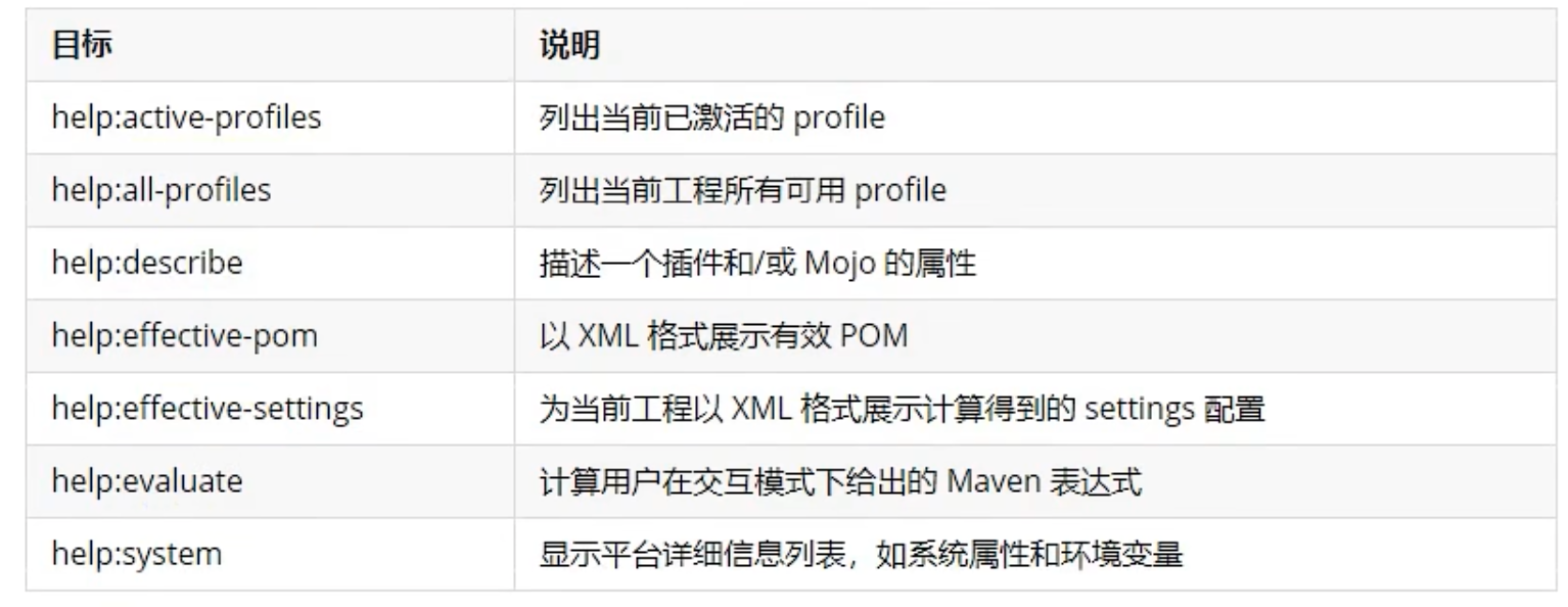 - help:用于展示spring-boot-maven-plugin的帮助信息。使用命令行mvn spring-boot:help -Ddetail=true -Dgoal=