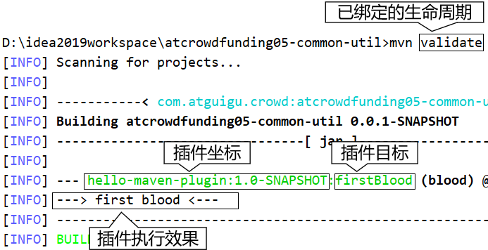 插件可以通过phase标签绑定到指定的生命周期环境。而在执行命令的时候,会执行该生命周期之前的所有生命周期关联的插件。