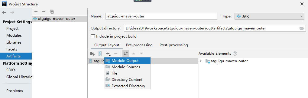 配置artifacts,打包成jar。project structure -> artifact -> moudule import。利用IDEA自动打包过程会添加MANIFEST.MF 文件到打包文件中。