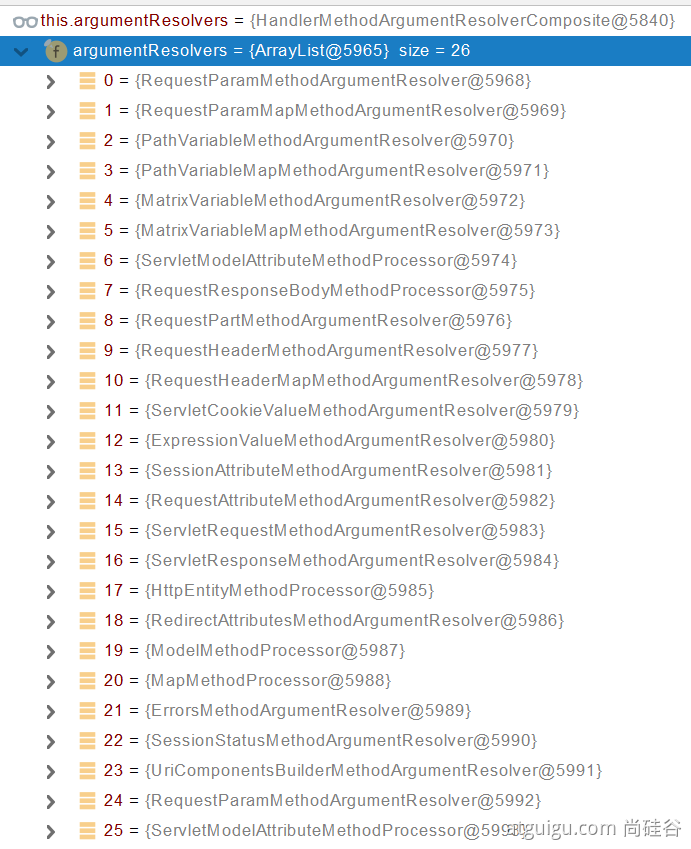 在上述方法中,调用参数解析器进行进行参数解析。可以看到springboot支持的所有的参数解析方法。