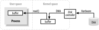 - 此调用导致内核向磁盘控制器硬件发出命令以从磁盘获取数据。 磁盘控制器通过DMA将数据直接写入内核内存缓冲区,而无需主CPU的进一步协助。