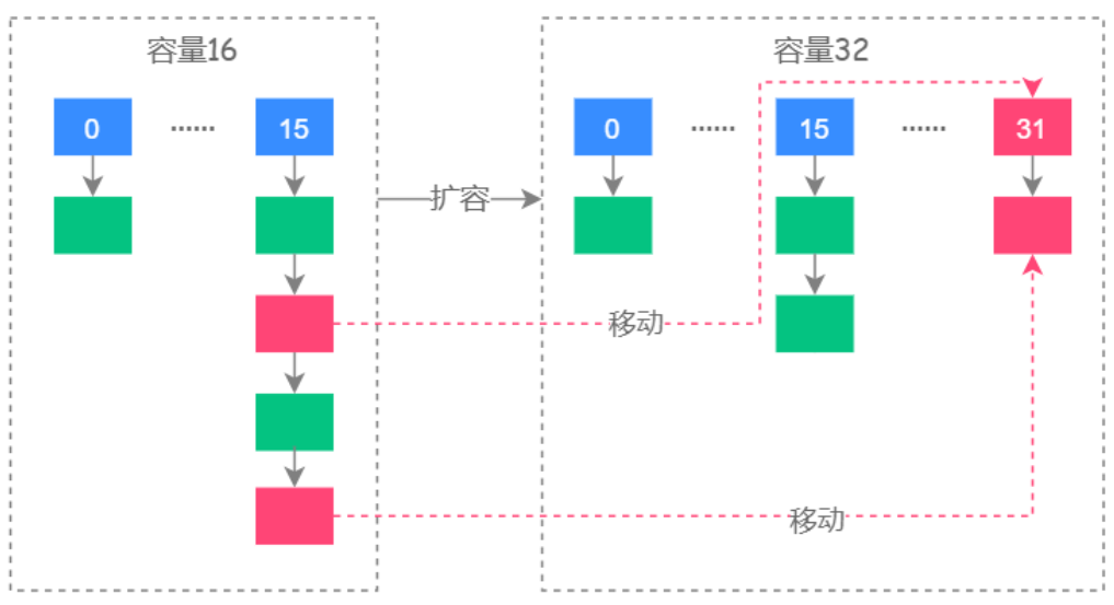 其中红色的虚线图代表了扩容时元素移动的位置。