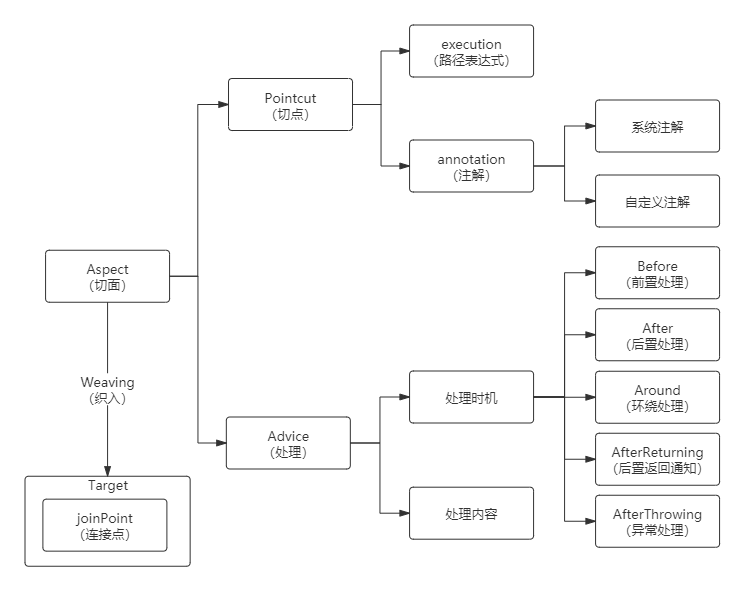 Advice:处理,包括处理时机和处理内容。处理内容就是要做什么事,比如校验权限和记录日志。处理时机就是在什么时机执行处理内容,分为前置处理(即业务代码执行前)、后置处理(业务代码执行后)等。