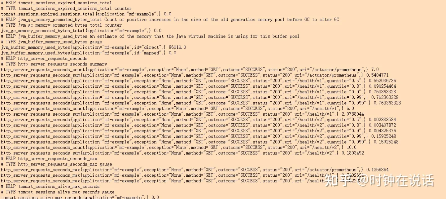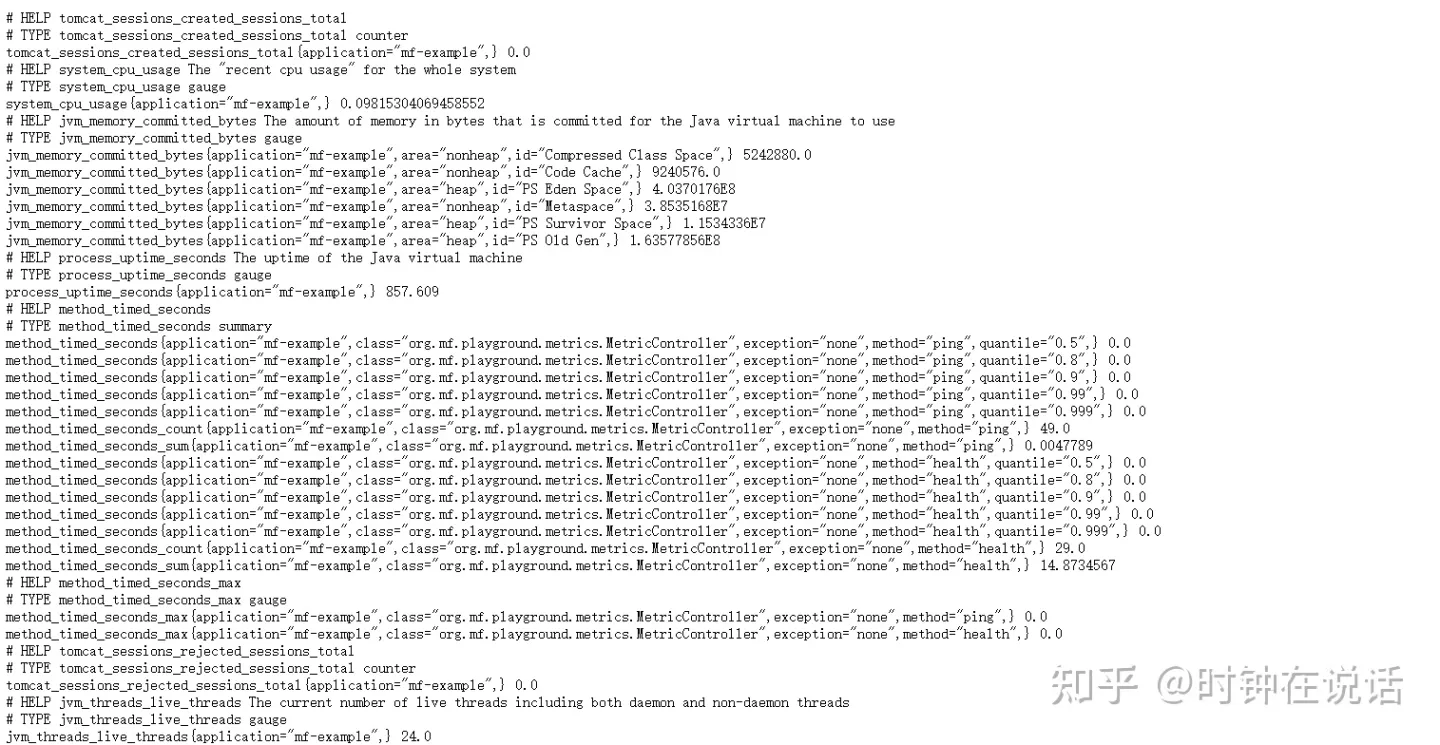 启动服务,访问http://localhost:8800/actuator/prometheus 可以看到以下服务指标数据:
