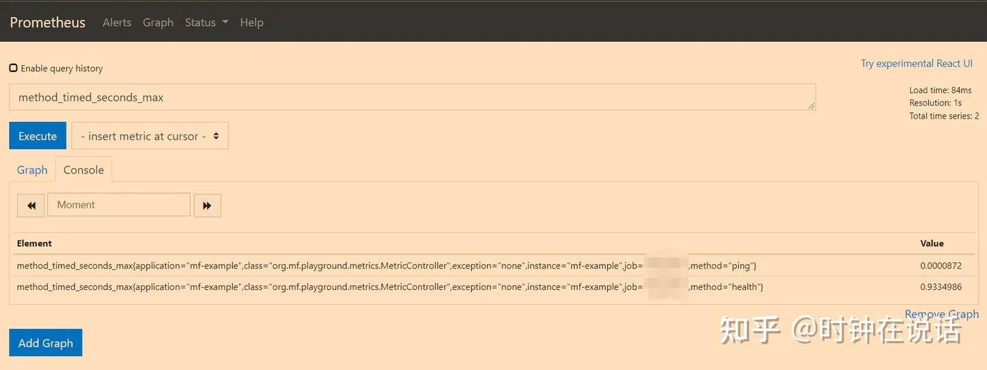 加入TimedAspect后的指标数据统计情况,可以看到同时记录了method_timed_seconds和http_server_requests_seconds两种名称的指标数据。并且这两种统计方式显示的接口耗时有一定误差,从执行流程上来看,使用TimedAspect方式计算耗时更接近方法本身逻辑执行占用时间