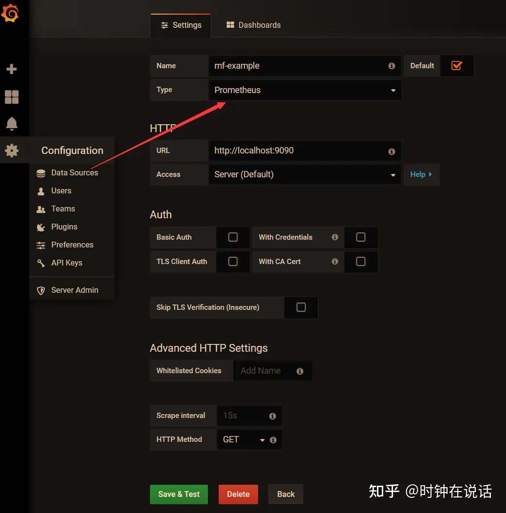 首先创建数据源,Grafana 支持多种数据源接入,此处我们选择 Prometheus。