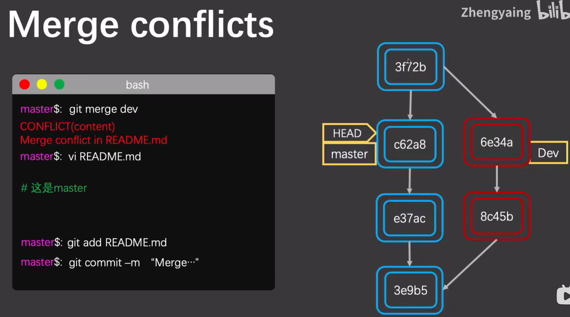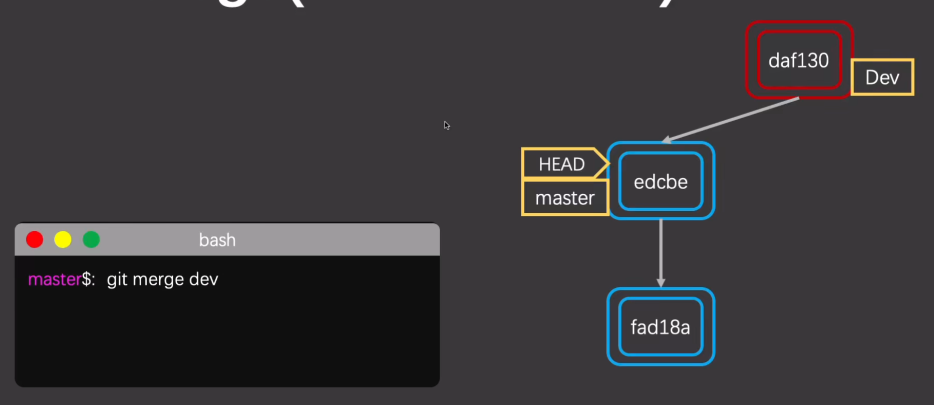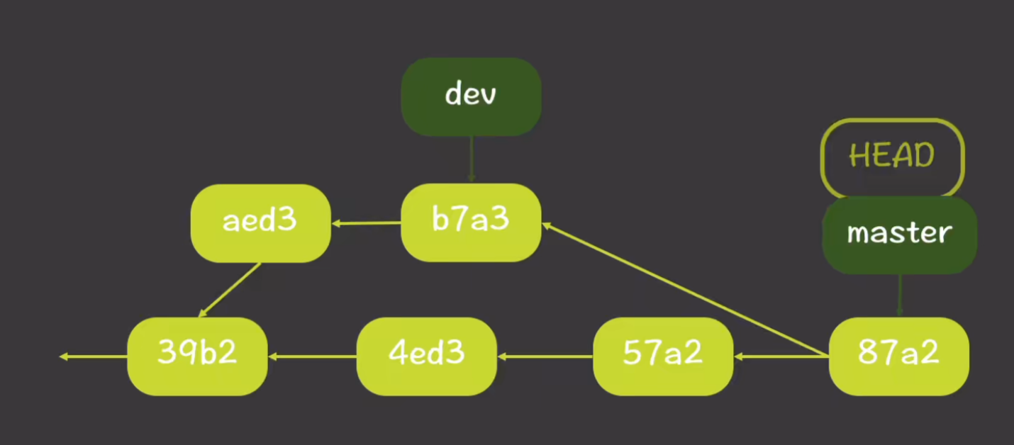 - 如果存在冲突,则会生成新的commit,其父指针同时指向之前的两个commit。