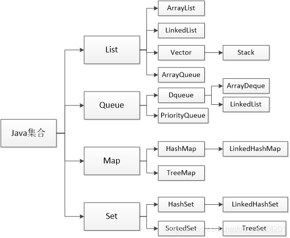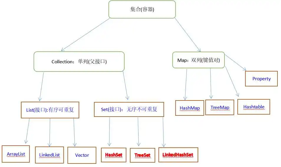 Collection和Map,前者是一个容器,存储一系列的对象;后者是键值对<key, value>,存储一系列的键值对 - 在集合框架体系下,衍生出四种具体的集合类型: